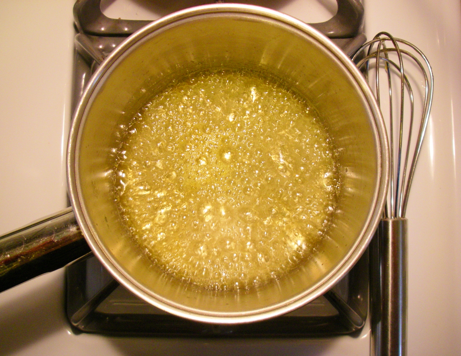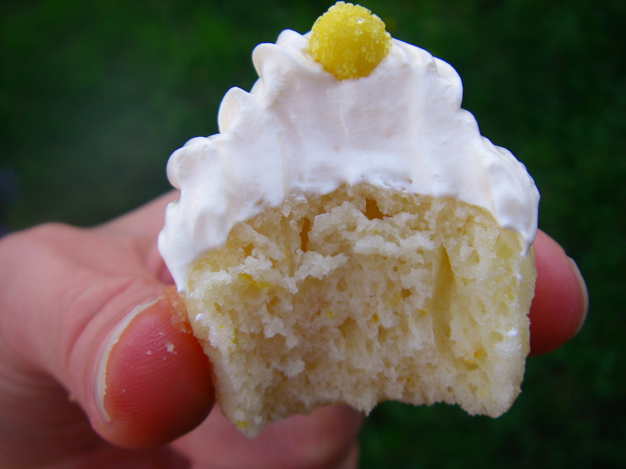 Remove from heat immediately, and with egg white mixture beating, slowly pour the syrup into the whites. Keep beating on high until bowl is no longer warm, but is room temperature to the touch; this should take about 8-10 minutes. If desired, add a drop or two of orange food coloring toward end of beating process. Before frosting gets too dry, pipe or pile it onto cooled cupcakes and top each one with a candied mimosa flower. These cupcakes taste best at room temperature, but keep them chilled if not eating within 8 hours or so.