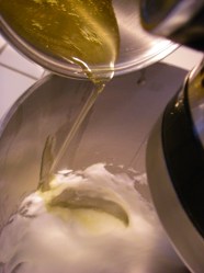 With an electric mixer (preferably free-standing), beat egg whites on medium-high until frothy and opaque. Add 1 tablespoon sugar; keep beating until soft peaks form. Separately, fill a 1/3 cup measure with about half champagne, half strained orange juice (freely adjust this ratio according to which flavor you prefer more of). Pour juice mixture into a saucepan and whisk in 3/4 cup sugar and corn syrup. Using a candy thermometer, bring to a boil until temperature just hits 230 F.