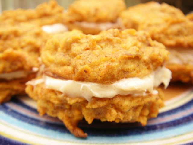 When I got home and found myself missing my nephews, I did something I knew would lift my spirits: baking therapy.  A creative, colorful process and the magnificent aroma of sweet spice were sure to soothe my soul.  And they did.  But aside from being sandwich-style, the cookies I made were very little like whoopie pies at all – not cakey or huge or chocolate.  Instead, they were chewy, spicy, small, and full of texture. Allow me to introduce them.