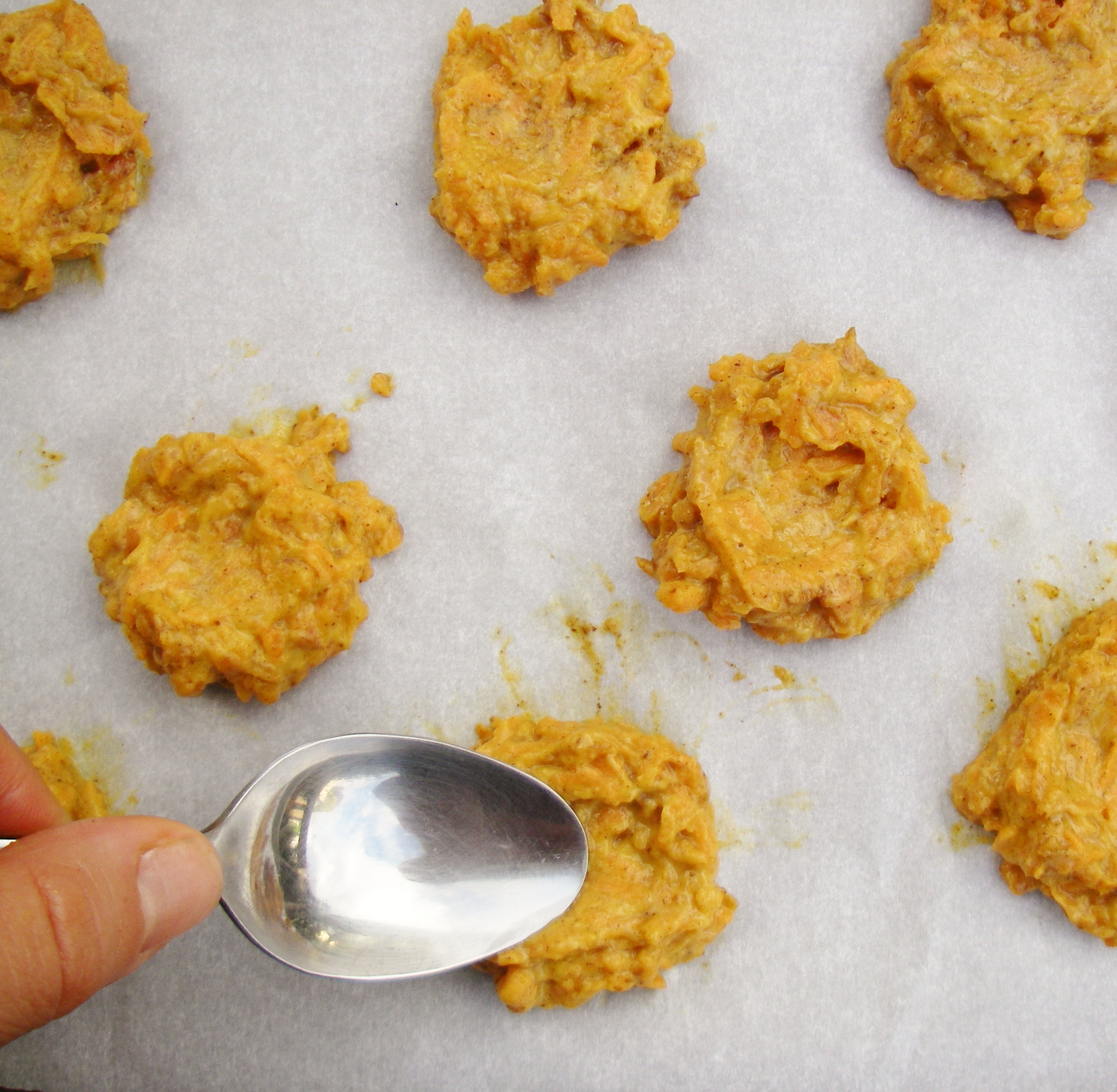 Preheat oven to 350 F.  Line 2 large cookie sheets with parchment paper.  In a large bowl, whisk together the sugar, butter, egg white, and vanilla until blended and smooth. Using a sifter or sieve over the sugar mixture, add flour, baking powder, salt, and spices. The dough will be dry; mix until ingredients are evenly distributed. Add carrots (I find it best to use bare hands), mixing them in until fully incorporated.  Drop dough by the heaping teaspoonful onto lined parchment to make 38 cookies or so. Gently push down the center of each dollop of batter with the back of a spoon.
