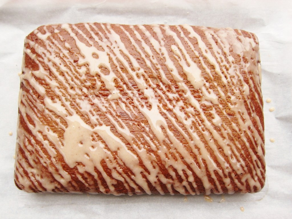 For an easy, pretty icing, whisk together ¾ cup powdered sugar, 1-2 tablespoons lemon juice (added gradually), and a few dashes cinnamon and nutmegDrizzle diagonally over cake using a fork or plastic bag with a small hole cut in its corner.  Let icing dry before serving.
