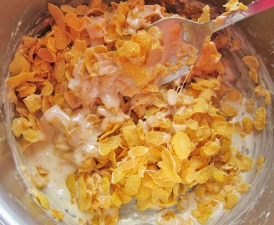 A rather funny trademark of Grandma was her stockpiling of household items she’d bought on sale.  Her cupboards were packed neatly with vast rows of canned tuna, packs of toilet paper, bottles of dish soap, and much more.  She took pride in letting her loved ones pick freely from her supplies on each visit.  When I moved away after high school and would come back to town, I felt lucky to reap these benefits.  On one instance, I returned to my apartment with two jumbo boxes of cornflakes: Grandma’s favorite cereal.  Upon an urge to make sweets soon after, I ignored my lack of cooking experience and turned to the cornflakes for inspiration. With a salute to Grandma’s generosity, I came up with this simple little recipe.