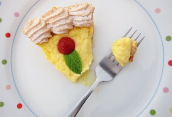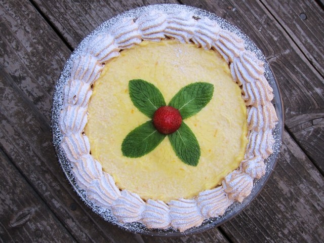 A little over a year ago, my husband gave me a potted lemon tree for my birthday.  He’d long known how much I’d loved lemons.  (He’d also seen how jealous I’d been of our neighbors, whose prolific trees I’d pass on my route to the grocery store, grumbling.)  After readily watching my tree ever since, I was thrilled to pick its first fruits a few weeks ago: three beautiful, succulent lemons.  Intent on turning them into something unusual that would really let their flavor shine, I began to brainstorm.  Traditional lemon meringue pie felt too commonplace, while a lemon tart seemed quite plain.  Then it hit me: rich, creamy lemon curd in a crust made of crisp meringue!