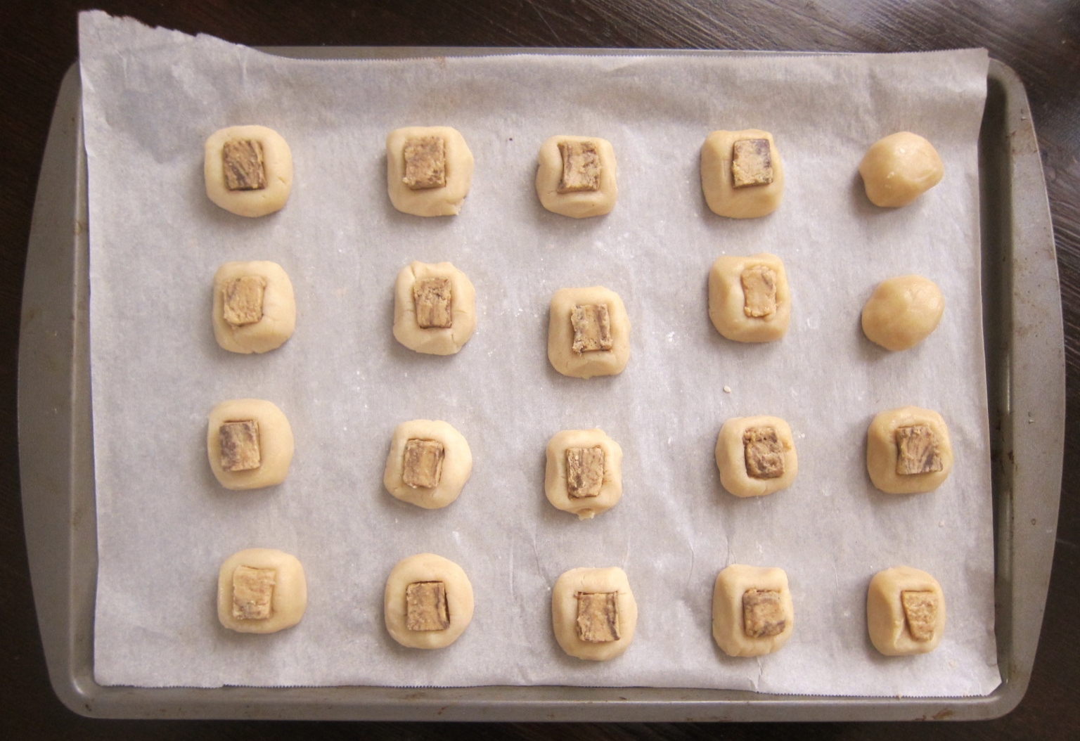 Halvah cookies (14)Form dough into balls a little over 2 teaspoons each (about .6 ounce a piece), placing them at least 1.5” apart from one another on prepared baking sheet.  Push a cube of halvah firmly into the center of each cookie, bracing sides of dough and squeezing gently to hold the halvah in place.  Freeze cookie sheet for 20 to 30 minutes (they will still spread a bit when baked, but this will help them hold their shape).