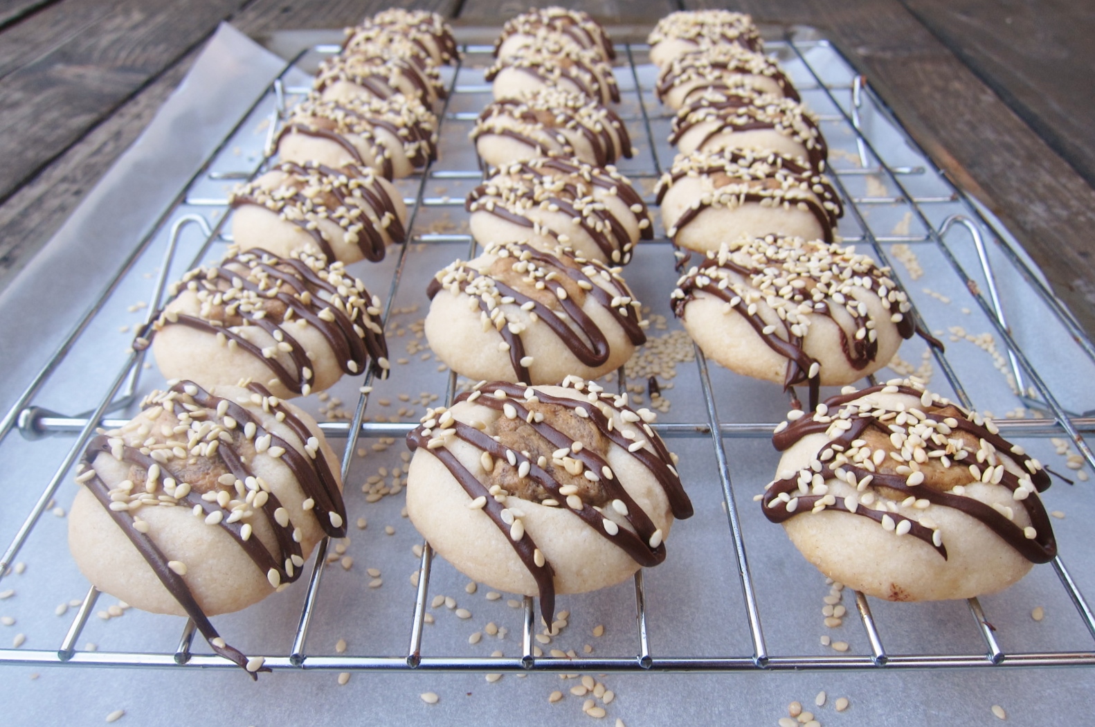 Surrounded with buttery shortbread dough and topped with rich chocolate, the decadence of halvah is truly celebrated in these one of a kind cookies.  A sprinkle of fragrant sesame matches perfectly with the sweet paste within, just as the crisp adornment pairs nicely with the crumble of the cookie. With their marvelous flavors inside and out, sesame halvah cookies would make grandma proud.  I only wish I could share them with her right now.