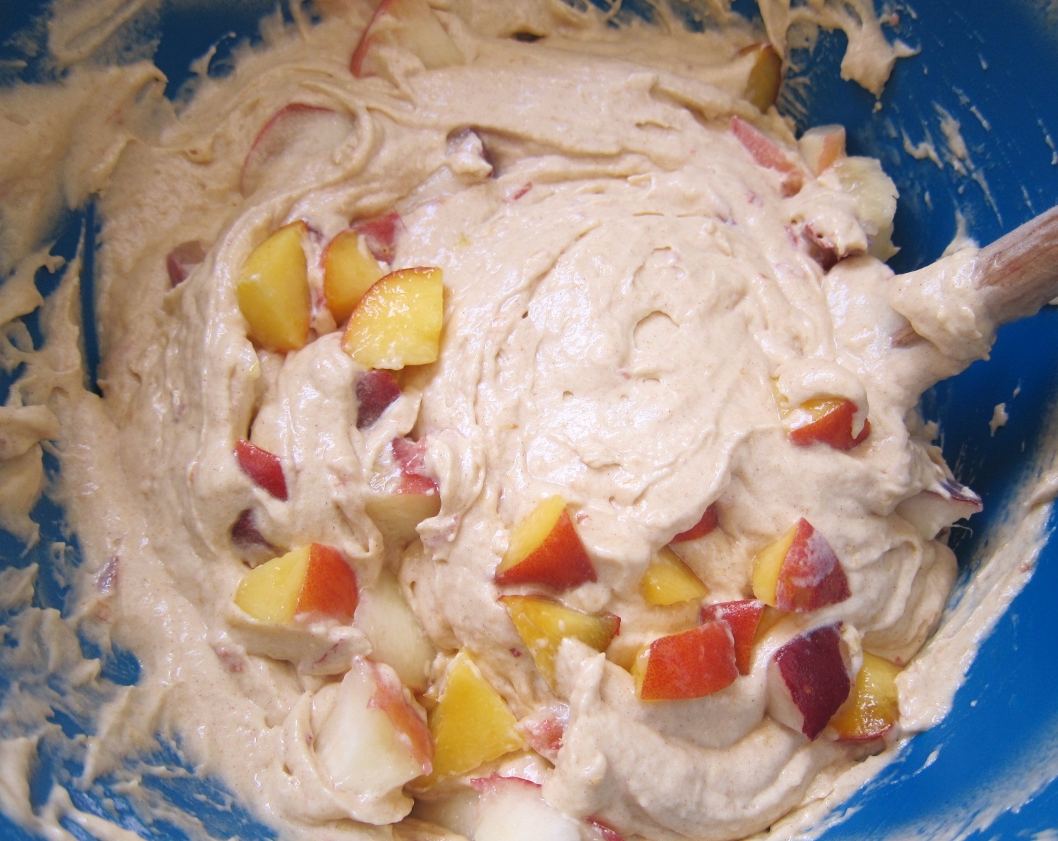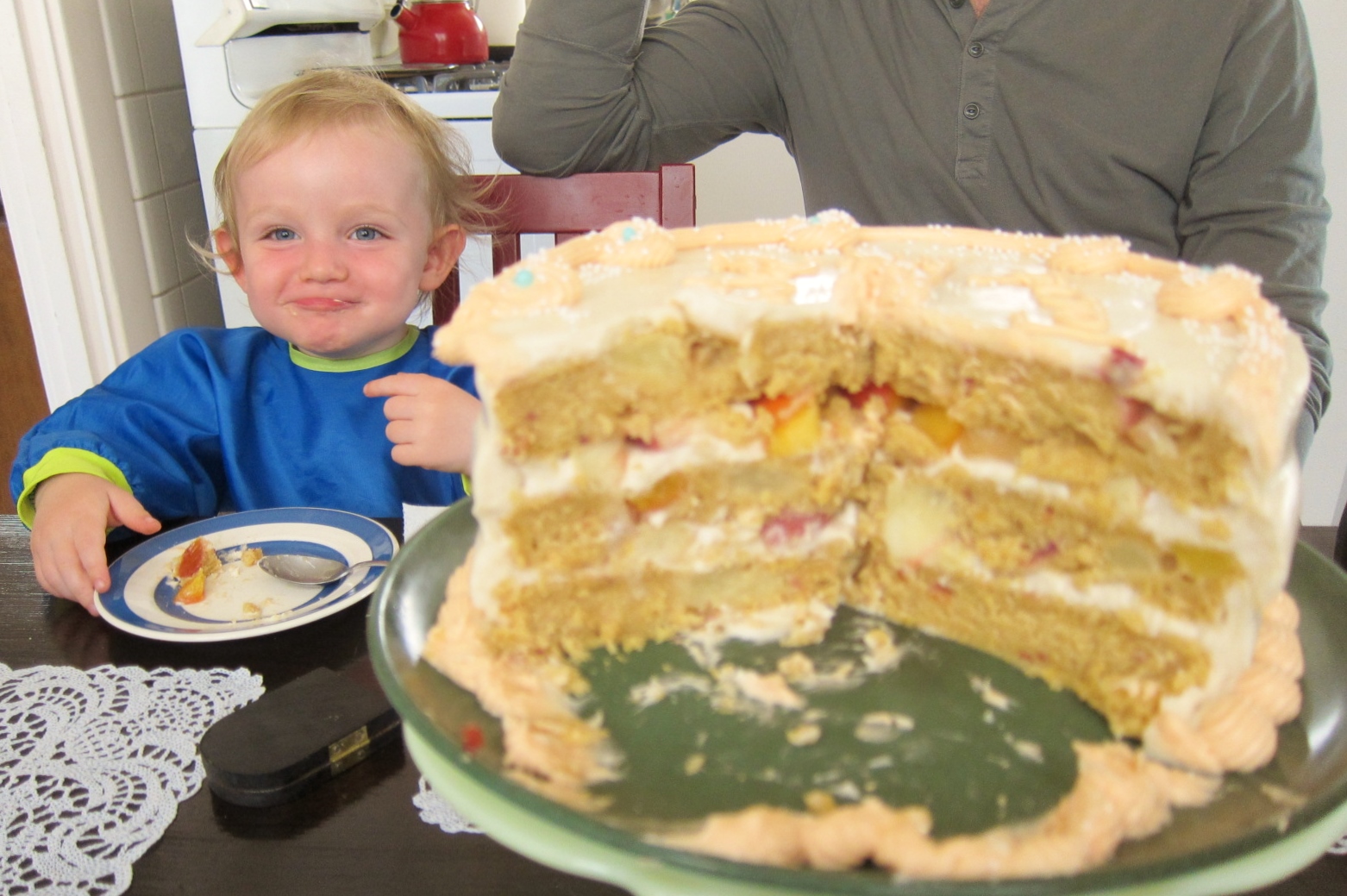 2013-07-06 14.16.11In addition to the wedding cupcakes I mentioned previously, this summer has brought a few birthdays of beloveds.  Embracing the season, my husband requested a fresh peach cake for his day, and I was happy to oblige.  I started with three pounds of peaches — some pureed, some diced, some sliced — and made a towering cinnamon peach cake with fruit segments both in the batter and between the layers.  It was truly decadent and yummy, but since I made it up as I went along, I’ve decided to give it another few test rounds before perfecting the texture and sharing the recipe here.  (I’m also Peach Cake 2thinking about a cinnamon peach whoopie pie cookie inspired by the cake — stay tuned!) Instead of splitting the birthday cake in two, we decided to invite our dear friends over, including their 23 month old.  Here, you can see a blurry side view of the cake’s peachy layers, and one very happy sweet peach behind it…