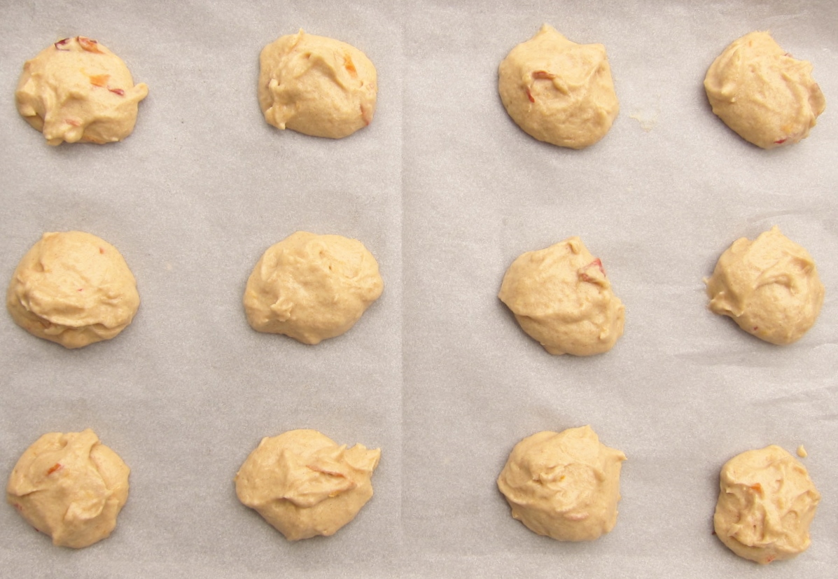 Preheat oven to 350 F. Line cookie sheets with parchment paper. Rinse the peach and remove its pit, leaving skin on, and blend it with the lemon juice in the bowl of a food