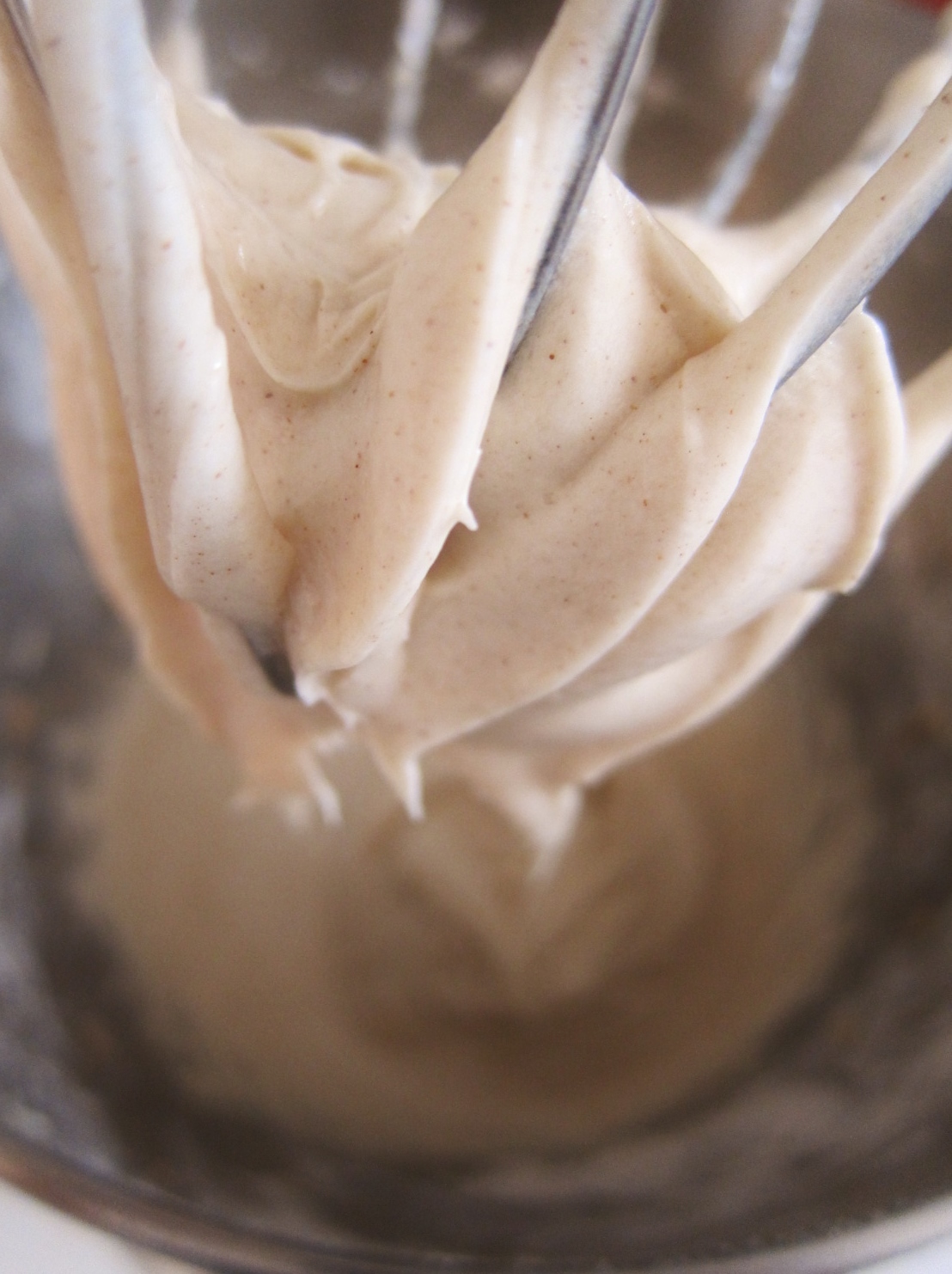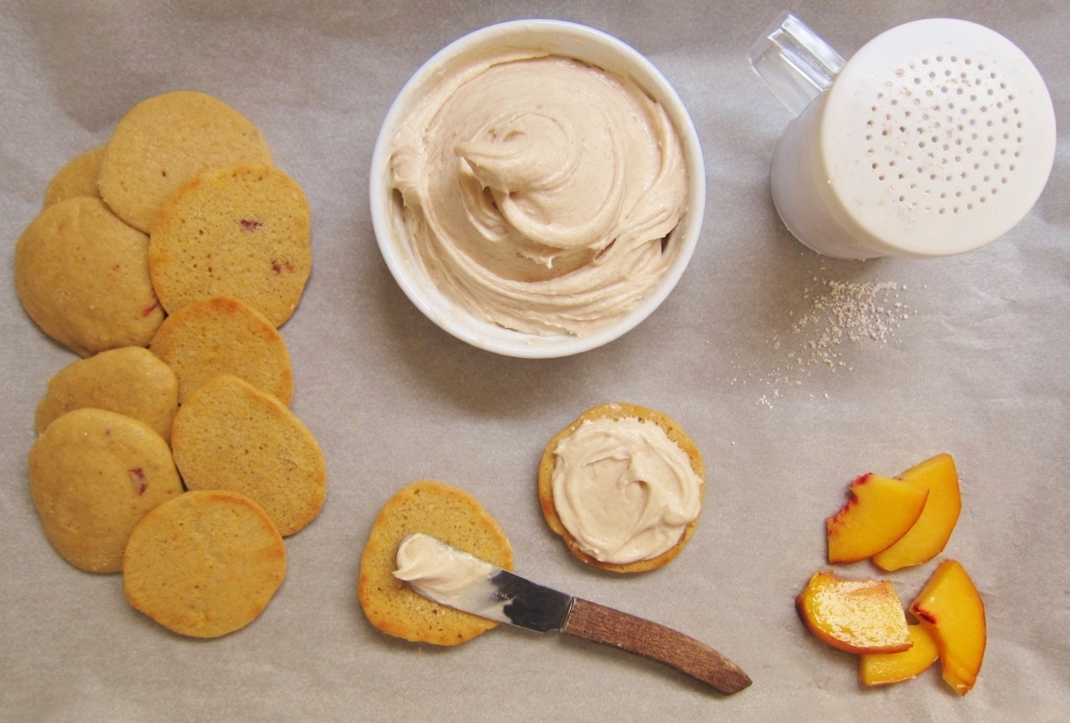 processor until thick, smooth and speckled with pieces of skin. Measure out 1/2 cup of the puree for the recipe; use the rest as you wish. In a large bowl, beat the butter and sugar until smooth; add the eggs one at a time, beating well after each addition, then beat in the vanilla. Over the butter mixture, sift the flour, salt, cinnamon, and baking powder. Begin to stir, gradually adding the milk and 1/2 cup peach puree. Mix until smooth, stopping to scrape down the sides of the bowl often. Scoop batter by the rounded tablespoon onto lined cookie sheets with plenty of space in between each dollop. Bake for 10 – 12 minutes. You should have about 28 cookies, each 2.5″ to 3″ in diameter, to make about 14 sandwiches. Let cookies fully cool on baking sheets. (Once cool, you can cover and store cookies at room temperature up to 24 hours, then fill when ready to serve.)