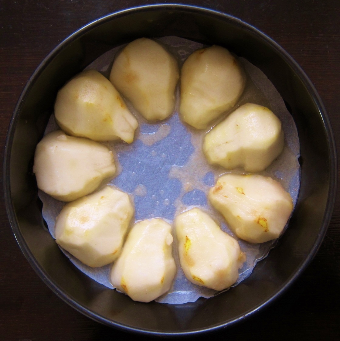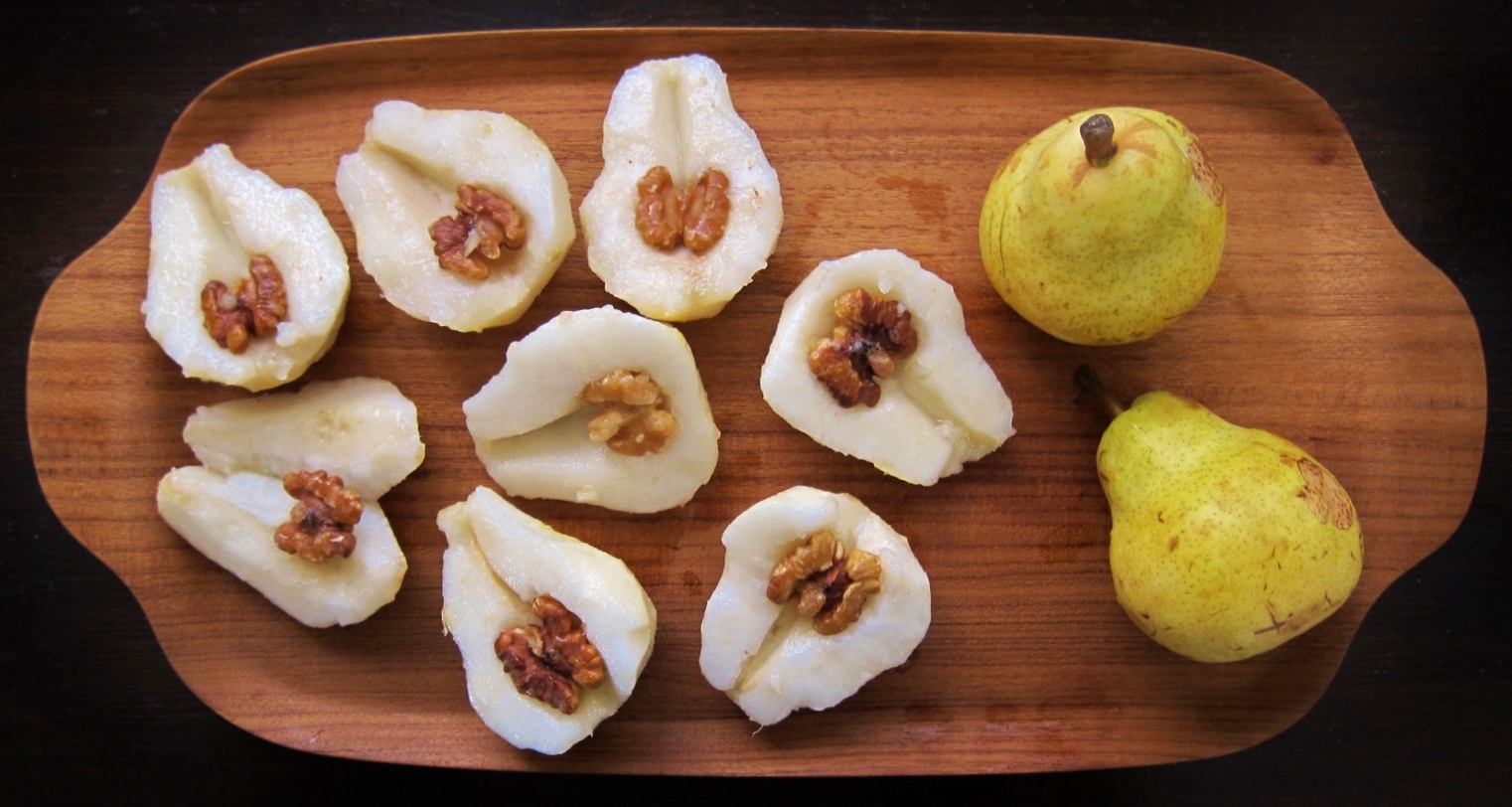 Peel pears and slice in half, removing stems, seeds and veins. After nuts are toasted, place one walnut half in each of the pear’s cut-out centers. Place the nut-stuffed pears sliced-side-down into the pan, narrow ends toward the center. (Depending on the size of the pears, it’s possible that not all halves will fit into pan.) Leave the oven on at 350 F, or turn off and re-preheat before beating egg whites.