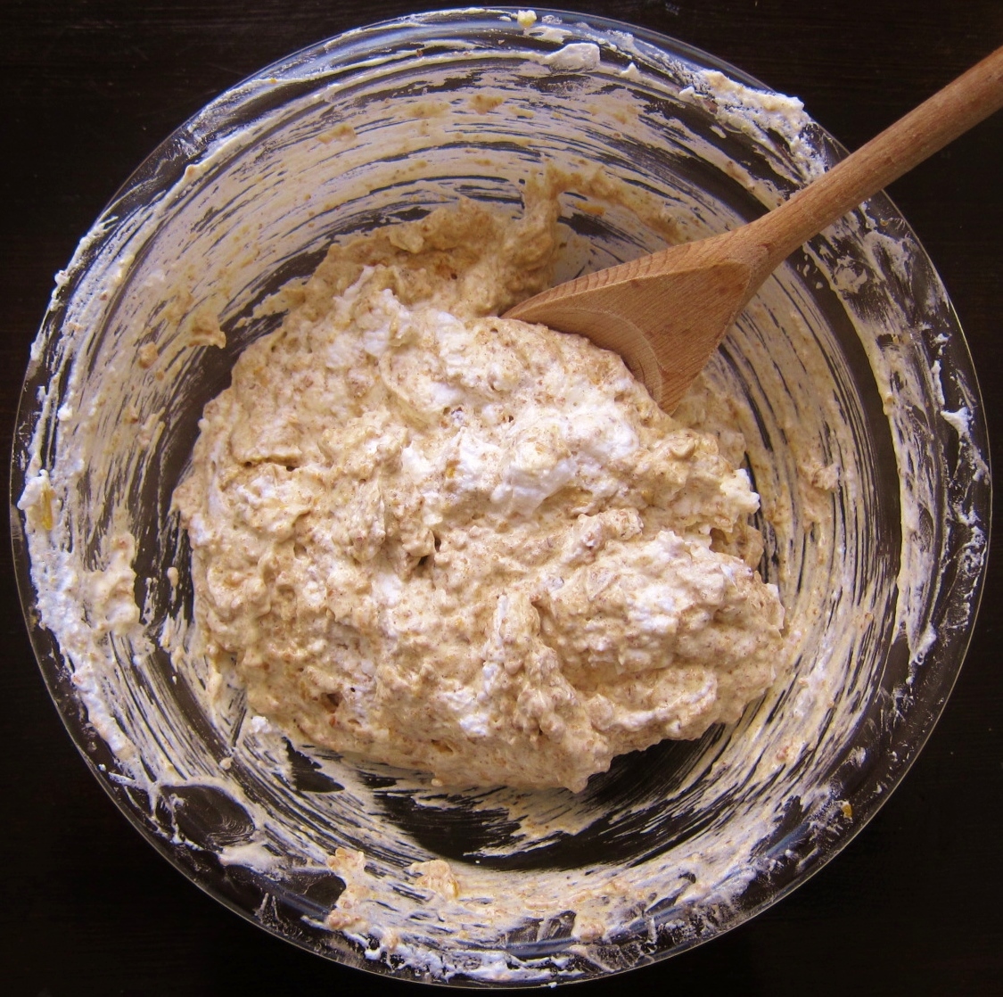 Scoop out about 1 cup egg whites, and mix it into the nut batter to loosen and moisten its texture. Then very gently fold in the remaining egg whites, slowly folding until the ingredients are equally distributed and a fluffy batter has formed — this can take a few minutes. Finally, spread the batter evenly over the pears.