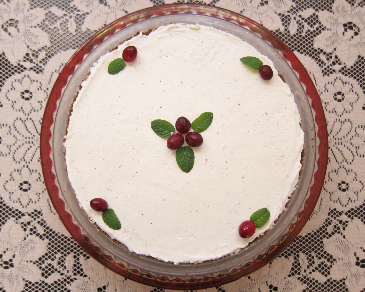 When the pie filling has cooled completely, beat whipping cream on high speed with 1 tablespoon sugar and ¼ teaspoon nutmeg, until voluminous and firm. Spread evenly over the cooled pie. If desired, decorate with fresh cranberries and peppermint leaves. Keep refrigerated and covered, serving chilled, and eating within 24 hours.