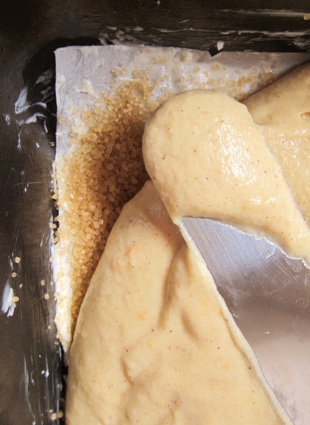 Place one oven rack on the lowest rung, and one at the center or a little higher. (The partial baking time on the lower rung will help create a crisp sugar layer.) Preheat oven to 325 F. Grease the sides and bottom of a 9 x 13″ pan, then line the bottom with parchment, and grease the top of the parchment. Sprinkle the buttered parchment evenly with the turbinado sugar, being sure to get it all the way to the edges. Set pan aside.
