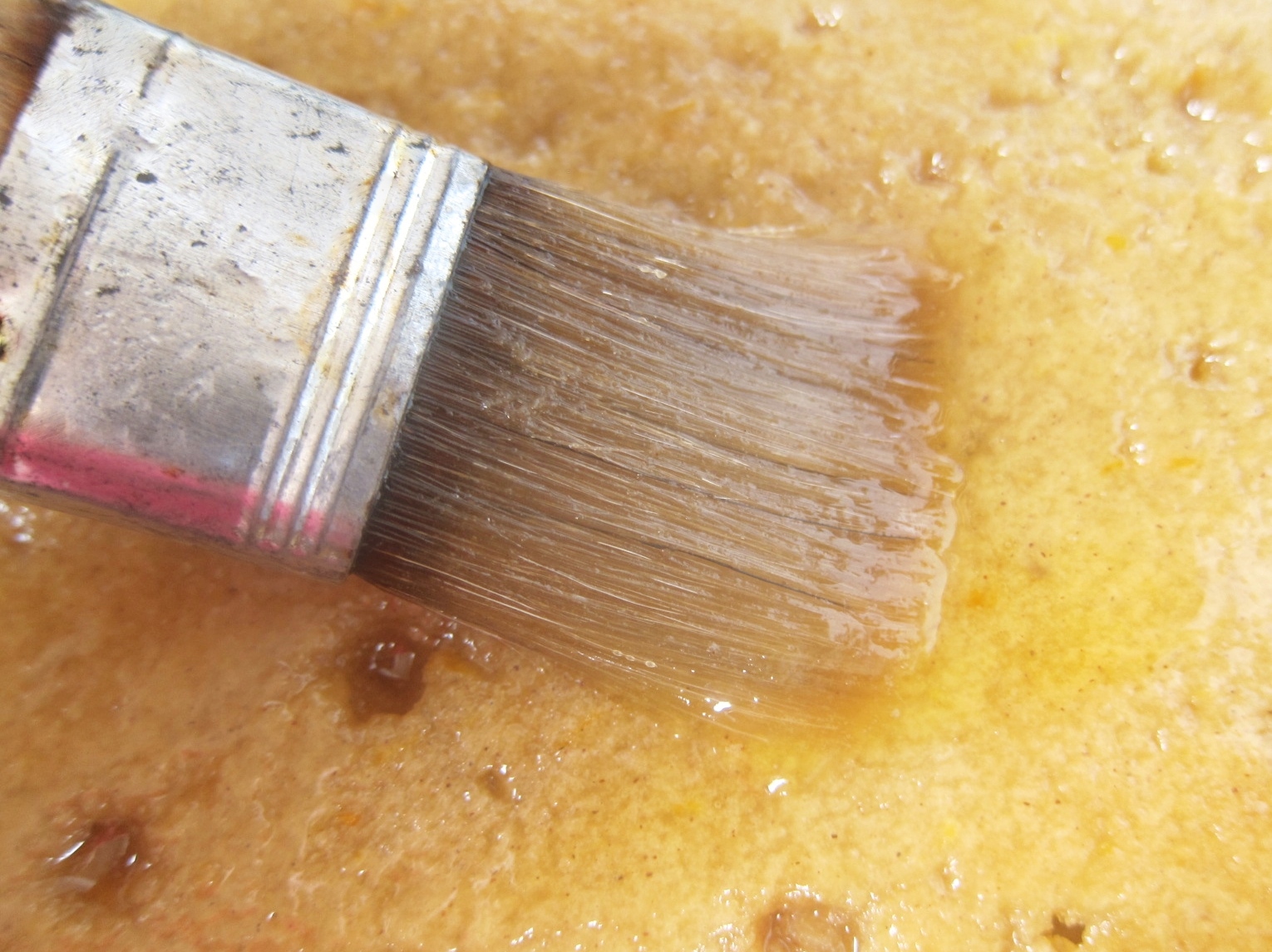 Gently spread batter into sugared pan, without pulling upward (you don’t want to move the turbinado sugar much). Set filled pan on the low rack in oven and bake for 20 minutes, then quickly and carefully move cake to upper rung (at center or a little higher); bake for about 12-15 minutes. Check cake’s center with a toothpick; when cake is done, toothpick will come out free of wet batter (a few moist crumbs are OK). Cake will be golden, domed and fragrant. Remove from oven; immediately make the buttered rum soak.