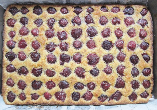 Transfer dough to prepared baking pan and spread evenly to edges. Add the cherries, cut side down in rows close together, and press them down gently. Keep in mind that they’ll shrink and will want to move around while baked.