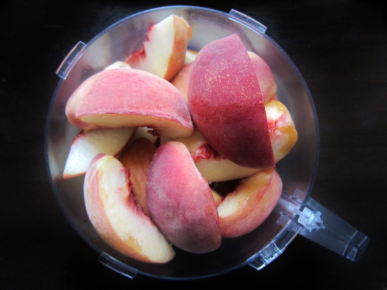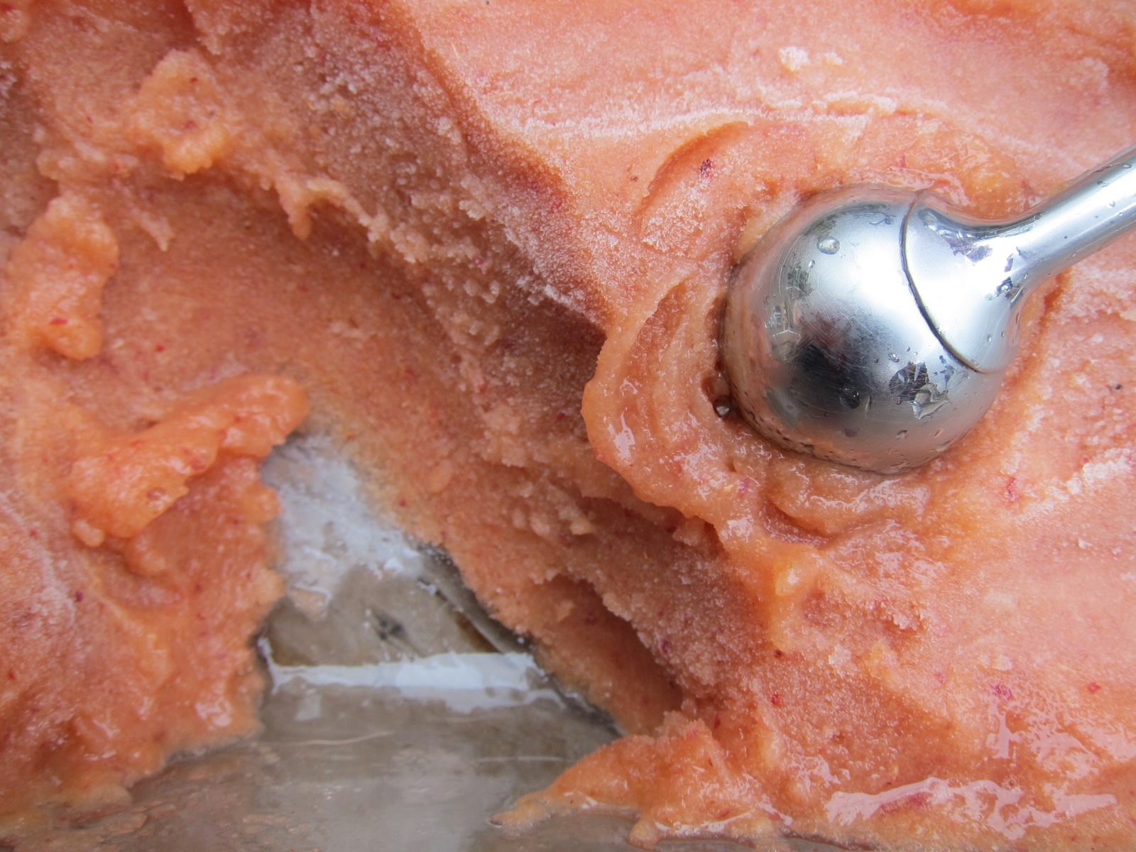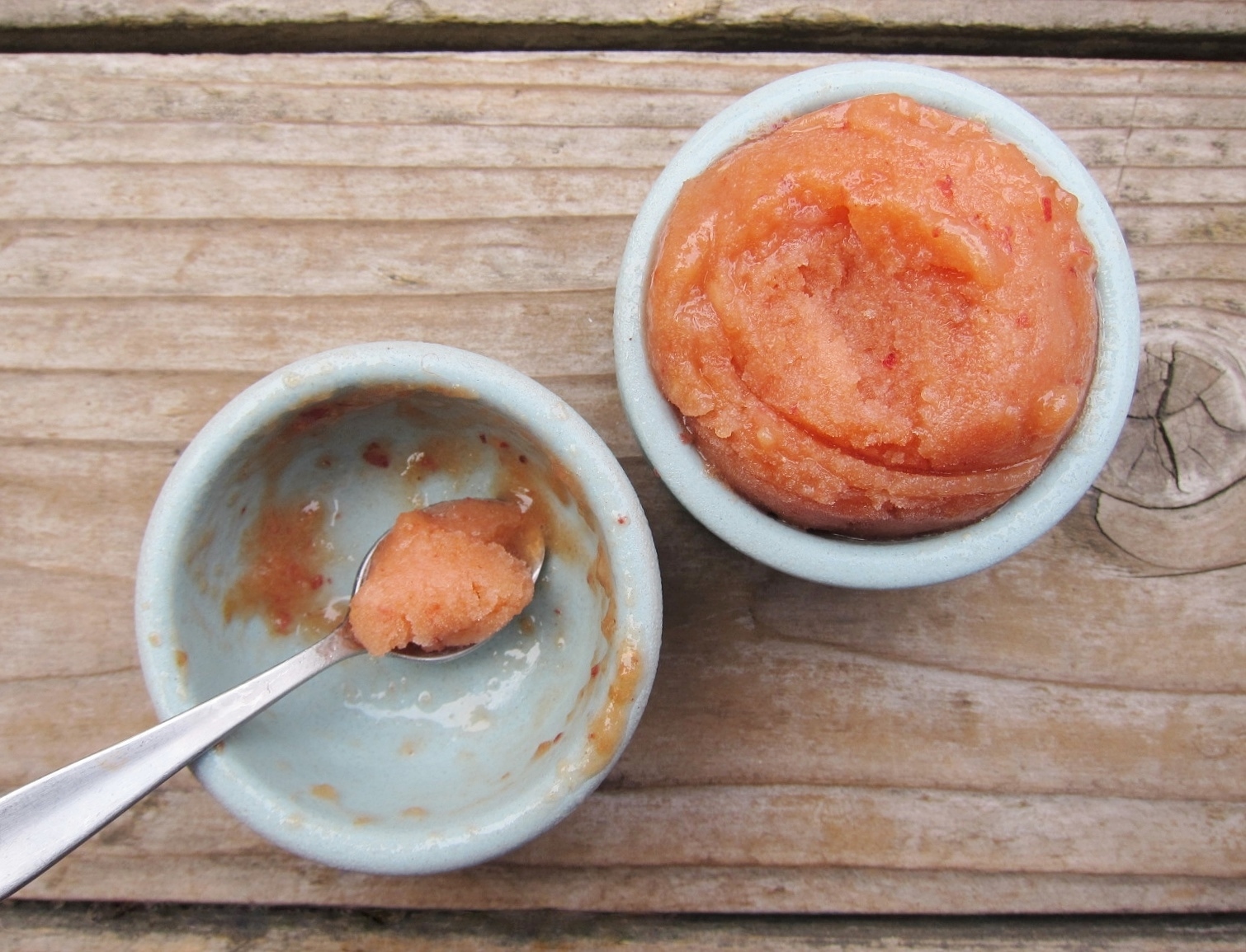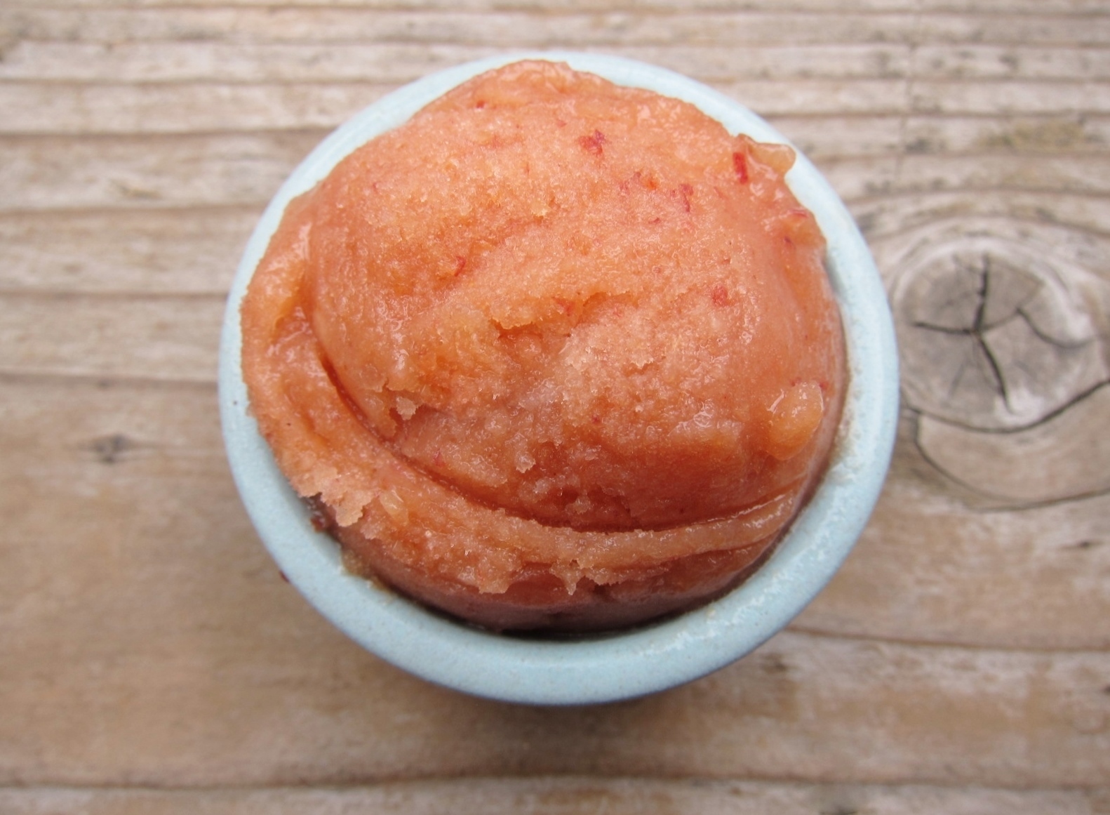Maybe next time: No peaches around when you’re reading this? Ripe, mild pears such as Bartlett would also work wonderfully. Feel free to peel the fruit if you want to, but there’s really no need: the speckles of skin give character to the texture, taste, and look of the sorbet — and the peach fuzz vanishes in the blending process. This sorbet is not too sweet and tends toward the sour side; if your fruit is especially un-sweet and/or you prefer a sweeter sorbet, feel free to increase the amount of sugar in the syrup up to ½ cup.