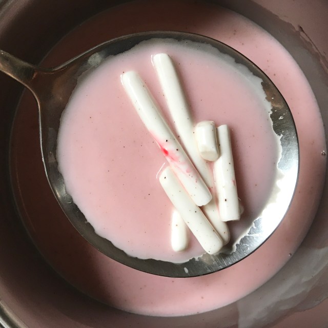[Note: Every once in a while, the mixture will stubbornly not thicken past about smoothie consistency when churned, even when the rum is omitted. This seems to be an effect of varying ingredients in different brands of candy canes. If this happens, don’t worry – just pour the mixture at its maximum thickness into your container, and freeze it an extra hour or two.]