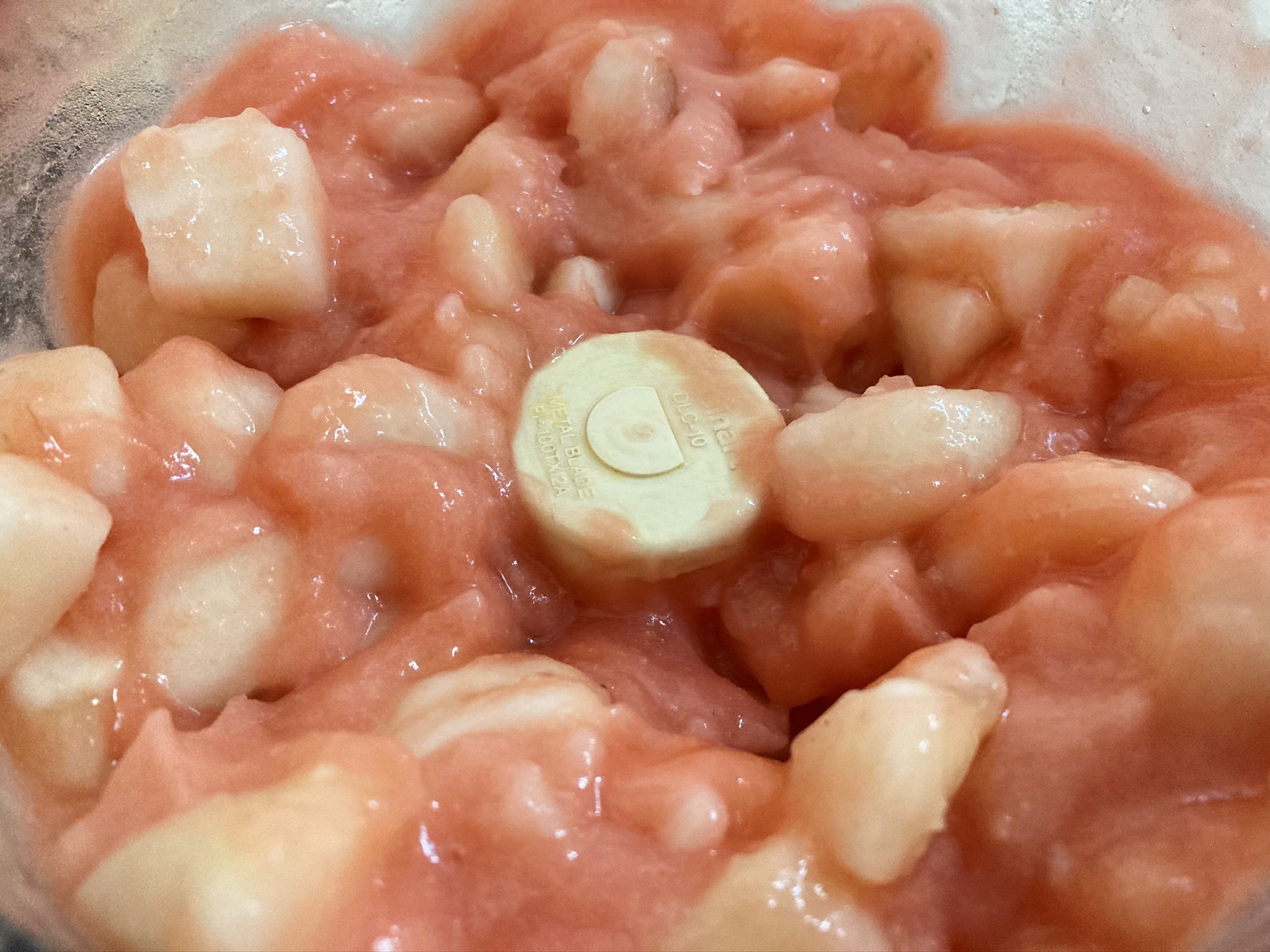 Done! Sorbet is fully blended when it spreads smoothly, and only a few tiny pear pieces are present.