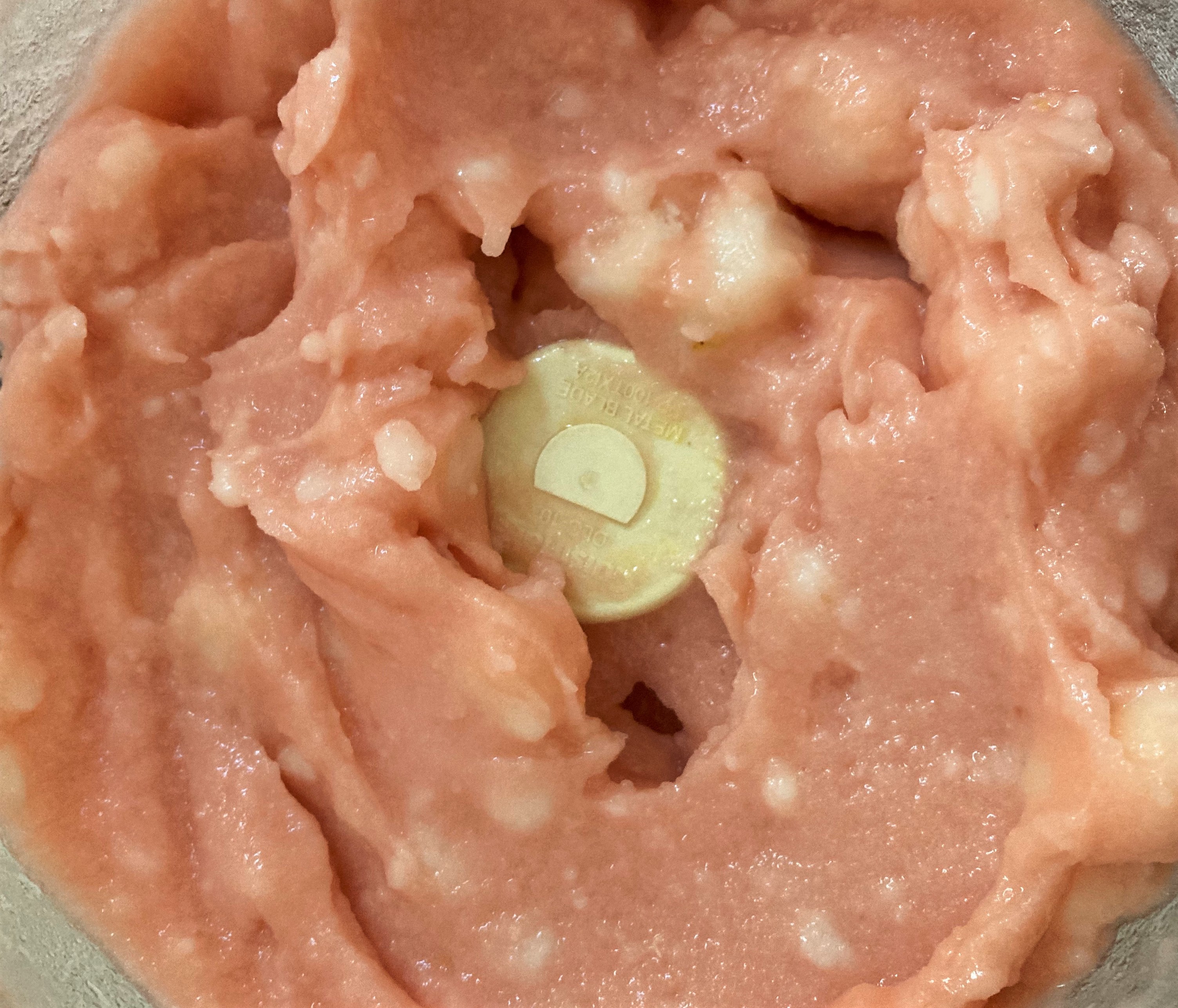 When ready to make the sorbet, place about half the frozen pear cubes in the bowl of the food processor, along with about half of the chilled syrup. Pulse and blend, adding more syrup if needed. Add the remainder of the pears and syrup in stages, blending in between. Stop regularly to turn off food processor and remove lid, scraping down the sides of bowl and pushing pears down gently as needed. Continue blending and pulsing until a smooth sorbet has formed. (This can require some patience and noise tolerance.)